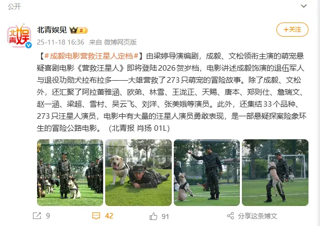 北京青年报的文娱账号发布了一条新闻,说电影《营救汪星人》定档,2026年的贺岁档期各大院线上映。在这条新闻当中,还说成毅、文松是这部电影的主演。成毅甚至于排在了文松的前面。这是一条很值得认真解读一下的电影定档新闻了。