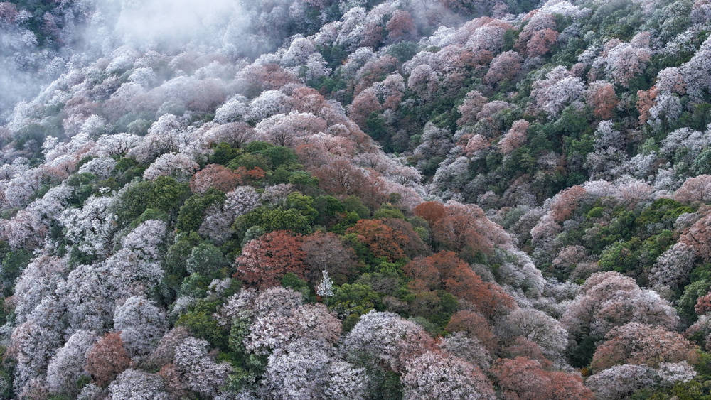 初冬时节,受强冷空气影响,世界自然遗产地贵州梵净山出现雾凇景观,洁白的冰晶与斑斓的红叶相映成景,美如画卷。